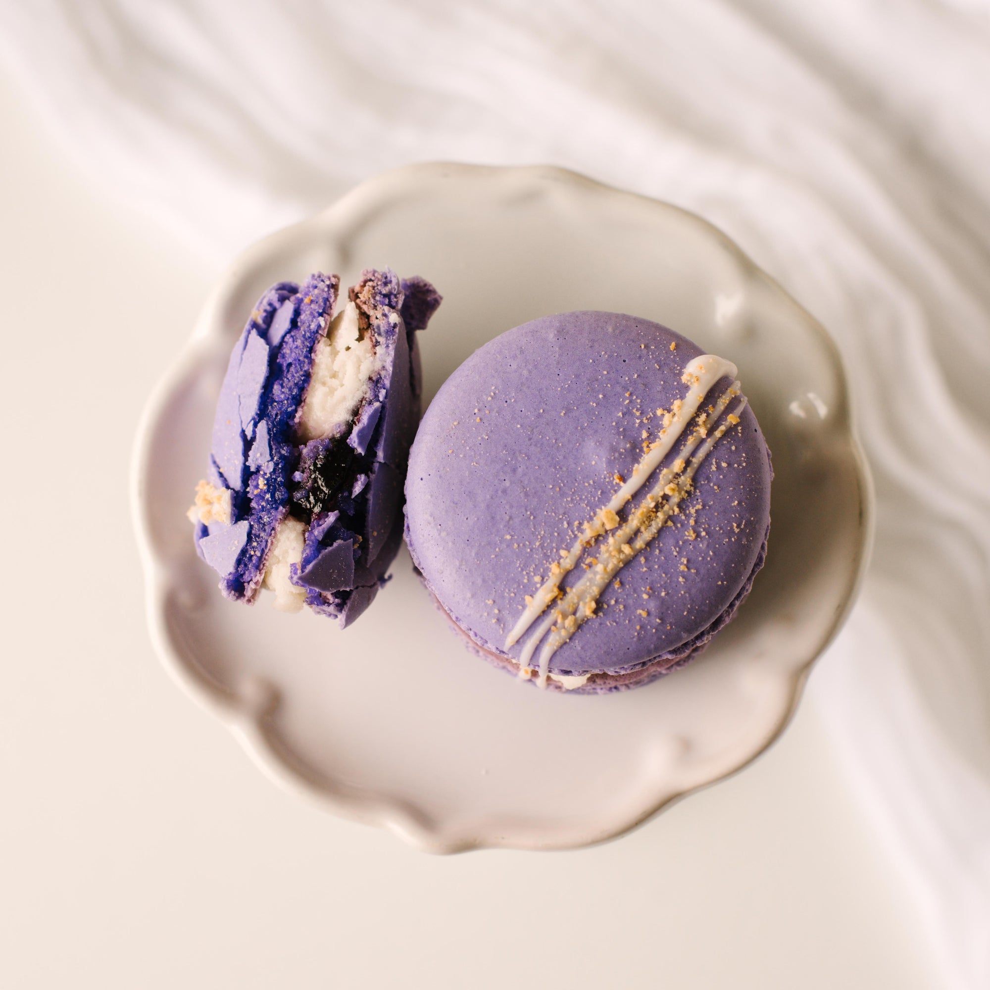 A beautiful macaron filled with blueberry filling, graham cracker pieces, and cream cheese frosting.