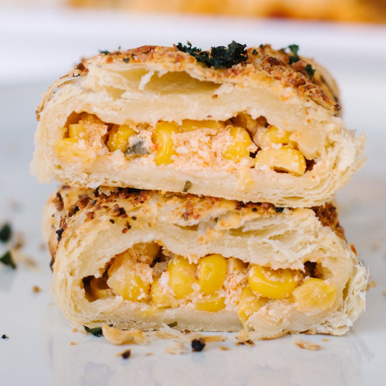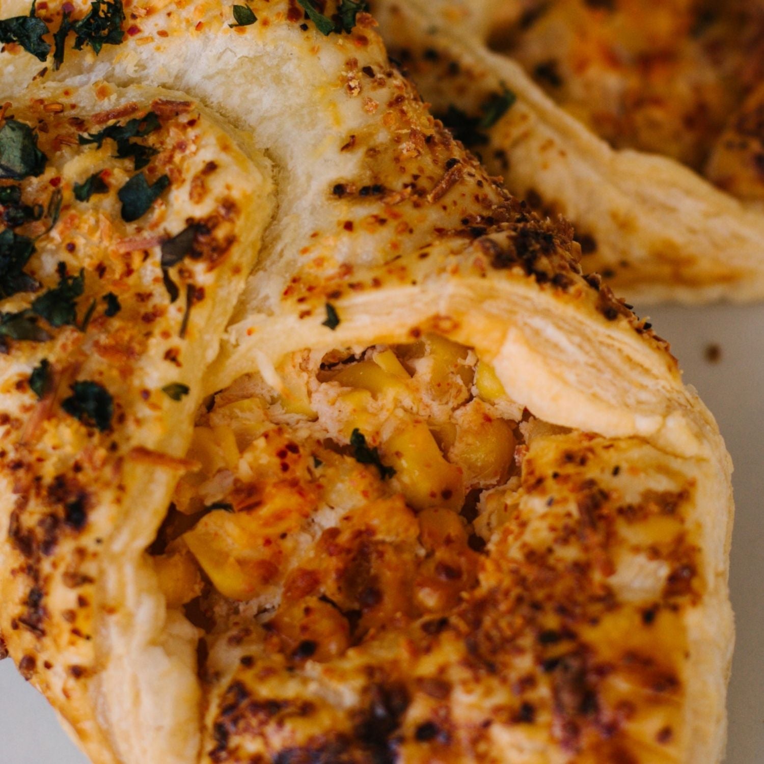 A buttery, flaky folded pastry filled with a street corn mix. Topped with cilantro and tajin.
